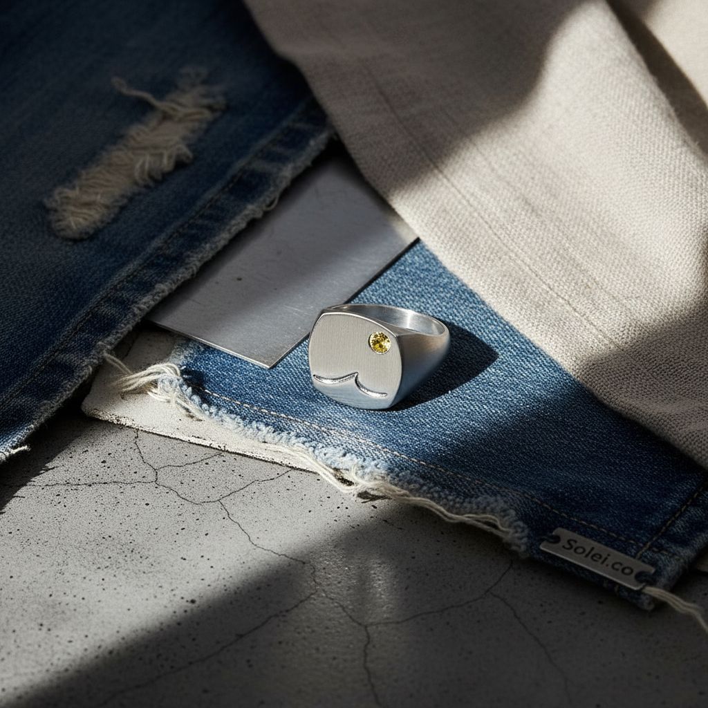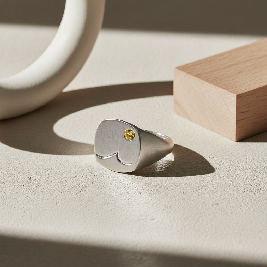 Crafted from solid 925 sterling silver, this bold signet ring pairs a minimalist wave engraving with an off-centre yellow sapphire accent, creating a modern, sea-inspired statement piece.